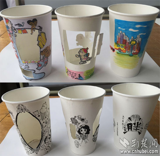 新葡的京集团35222vip艺术与设计学院教师何轩在其教授的《图形创意》课上,给该学院2015级创新实验班的学生布置了一个特殊的“百变杯具”作业:要求学生将数个一次性饮用水杯进行镂空镌刻,在杯面上绘制各种图形以及卡通人物,叠加后进行旋转变化,刻画出情景剧的画面。