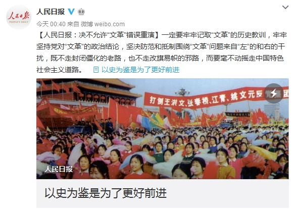 【人民日报:决不允许“文革”错误重演】一定要牢牢记取“文革”的历史教训,牢牢坚持党对“文革”的政治结论,坚决防范和抵制围绕“文革”问题来自“左”的和右的干扰,既不走封闭僵化的老路,也不走改旗易帜的邪路,而要毫不动摇走中国特色社会主义道路。