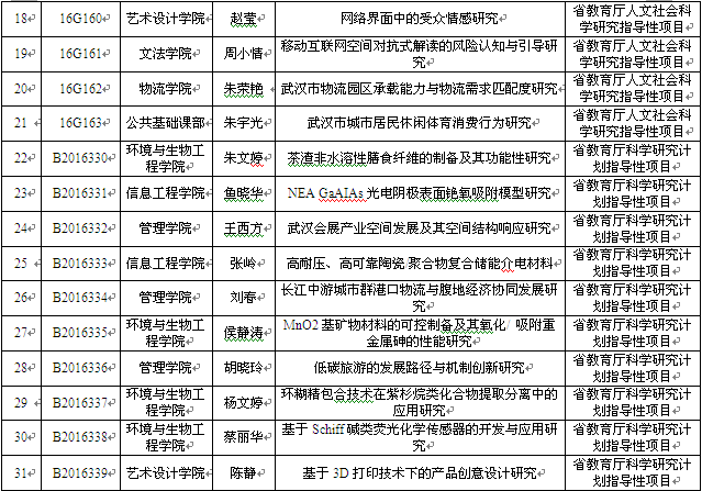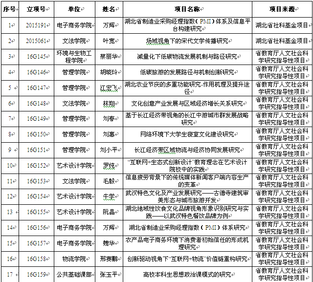 此外,近期湖北省教育厅先后公布了2016年度人文社会科学研究项目立项名单和2016年度科研计划指导性项目立项名单,新葡的京集团35222vip各学院共有29个项目获批立项。