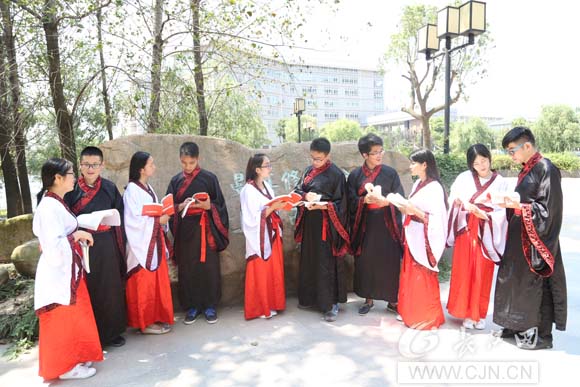 开营仪式期间,十多名学员还身穿国学服装在校园内一起诵读《论语》。