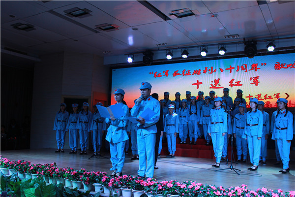 新闻中心讯(见习记者 杨芳 张赫彦)为纪念长征胜利80周年,培养学生的爱国主义情操,增强爱国主义情感,深入开展爱国主义教育活动,10月22日晚7:00,新葡的京集团35222vip纪念红军长征胜利80周年歌咏比赛在校学术报告厅举行。该校党委书记陈伟、党委副书记孙松发、学工部部长陈义文、新疆教育厅内派干部云梁老师、民族教育学院常务副院长张兆学、物流学院党总支书记蔡菁、电子商务学院党总支书记杨睿、环境与生物工程学院党总支书记陈玲以及200多名师生代表一同观看了比赛。