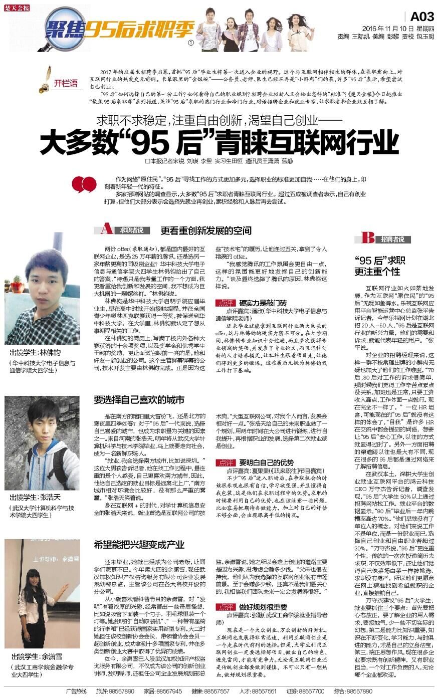 “95后”如何选择自己的第一份工作?如何看待自己的职业规划?招聘企业招新人又会给出怎样的“标准”?《楚天金报》今日起推出“聚焦95后求职季”系列报道,关注“95后”求职的热门行业和冷门行业,对话招聘企业和就业专家,让求职者和企业能互相了解。
