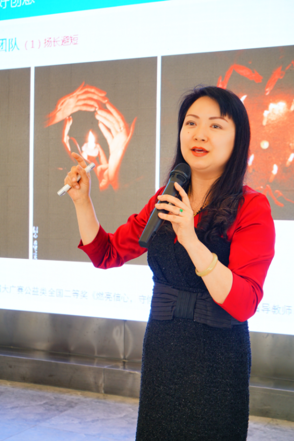 王晔还谈道,除了大赛组委会设置的奖项以外,由于所有题目都是企业出题,真题真做,为此,企业也设置了“企业奖”,并提供丰厚的奖金或奖品。为了让同学们更直观地感受到获奖作品的“含金量”,她现场展示了“企业奖”的大量获奖作品,并分析、讲解了这些作品的获奖原因。她总结道,参赛者要能读懂市场、读懂企业、读懂品牌、读懂产品以及读懂消费者心理等,这样创作出来的作品才能吸引企业家的眼球,获得“企业奖”。