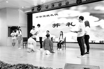 ——笄礼,重现盥洗、加笄、醴礼、三拜、谢拜等传统汉式女子成人礼的礼节,重温中华民族传统礼仪。图为该校第一届“大学·人生”国学夏令营闭幕式上的学员分小组展示环节。