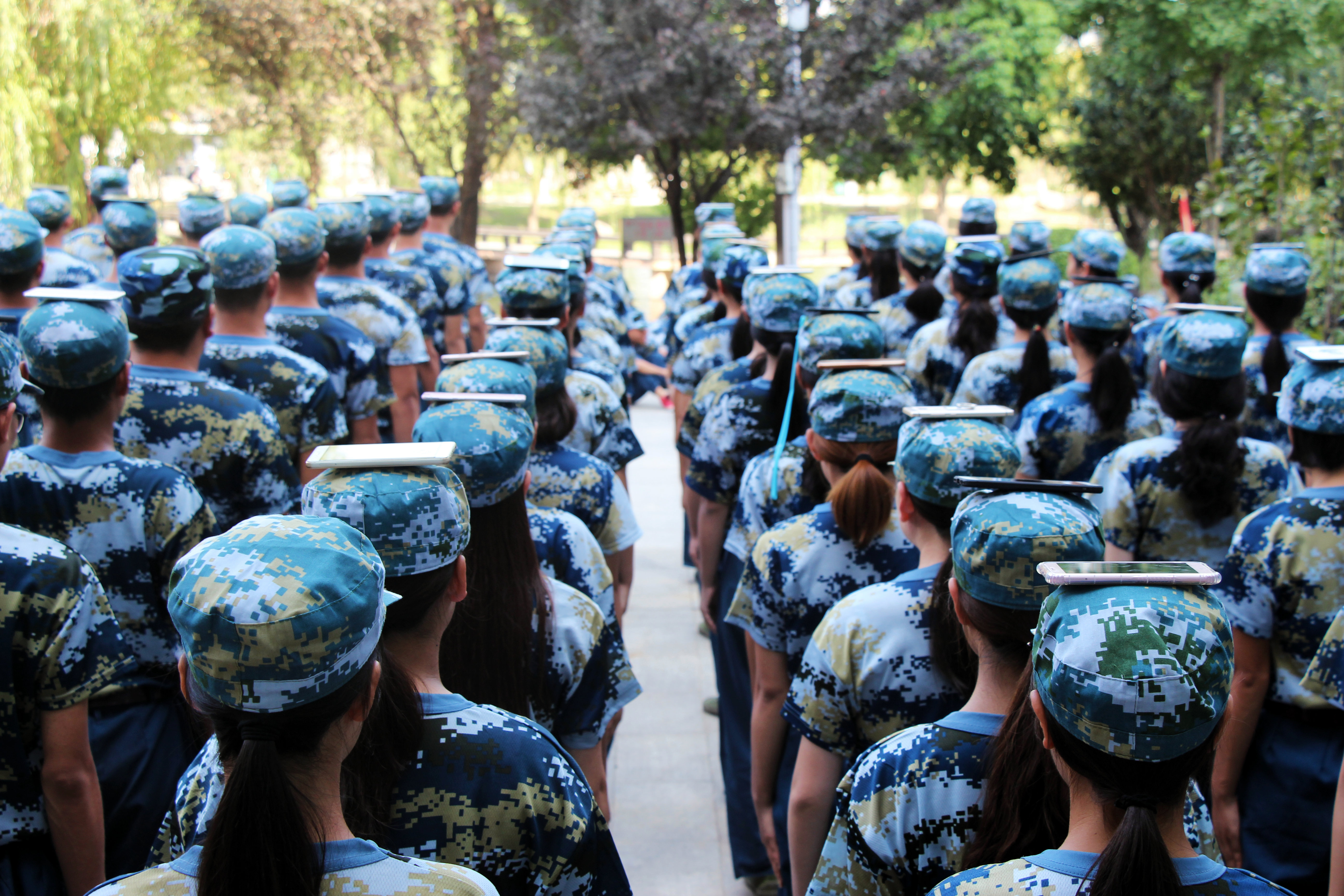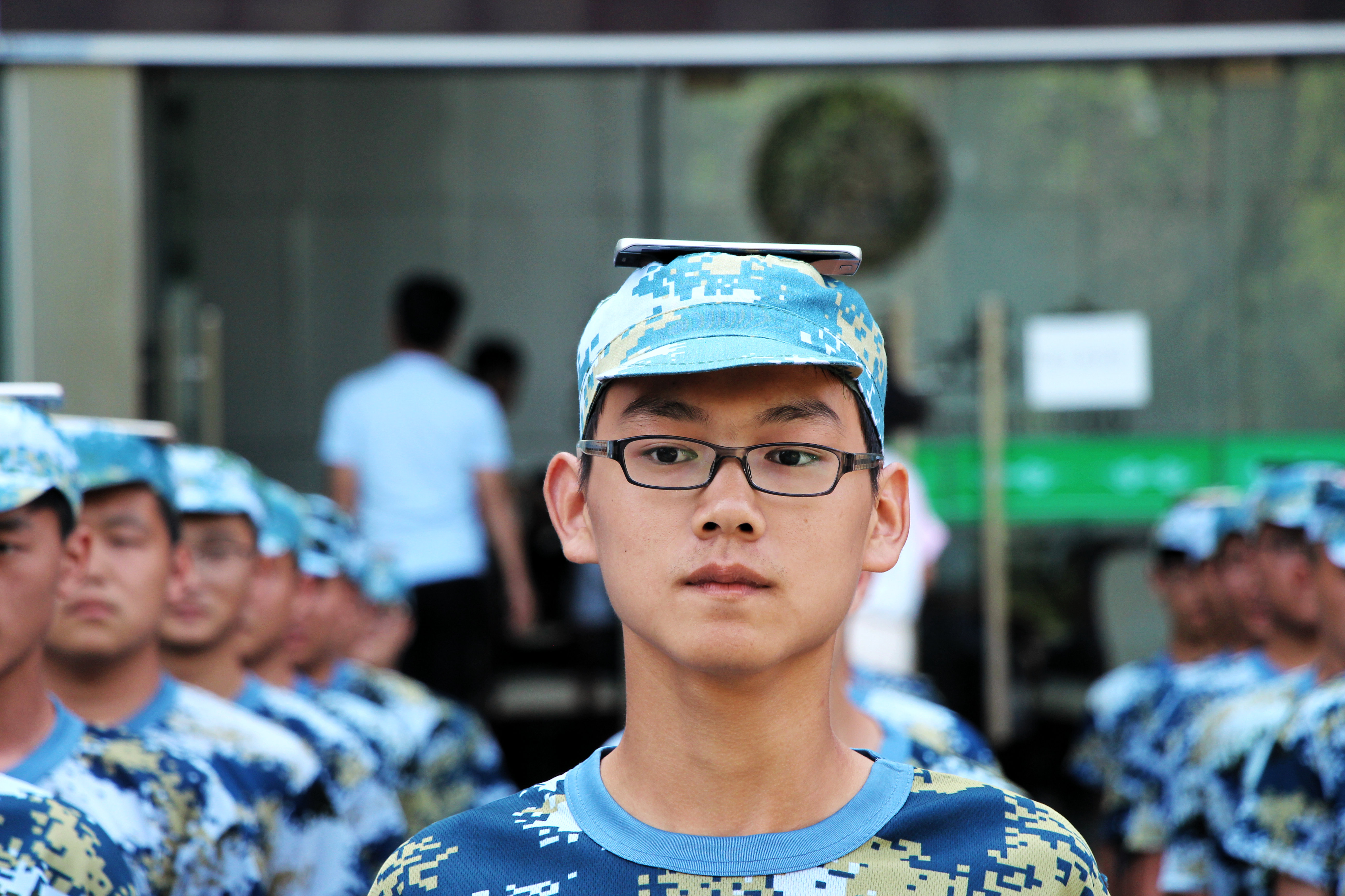 图为学生头顶手机训练军姿 摄影:林倩