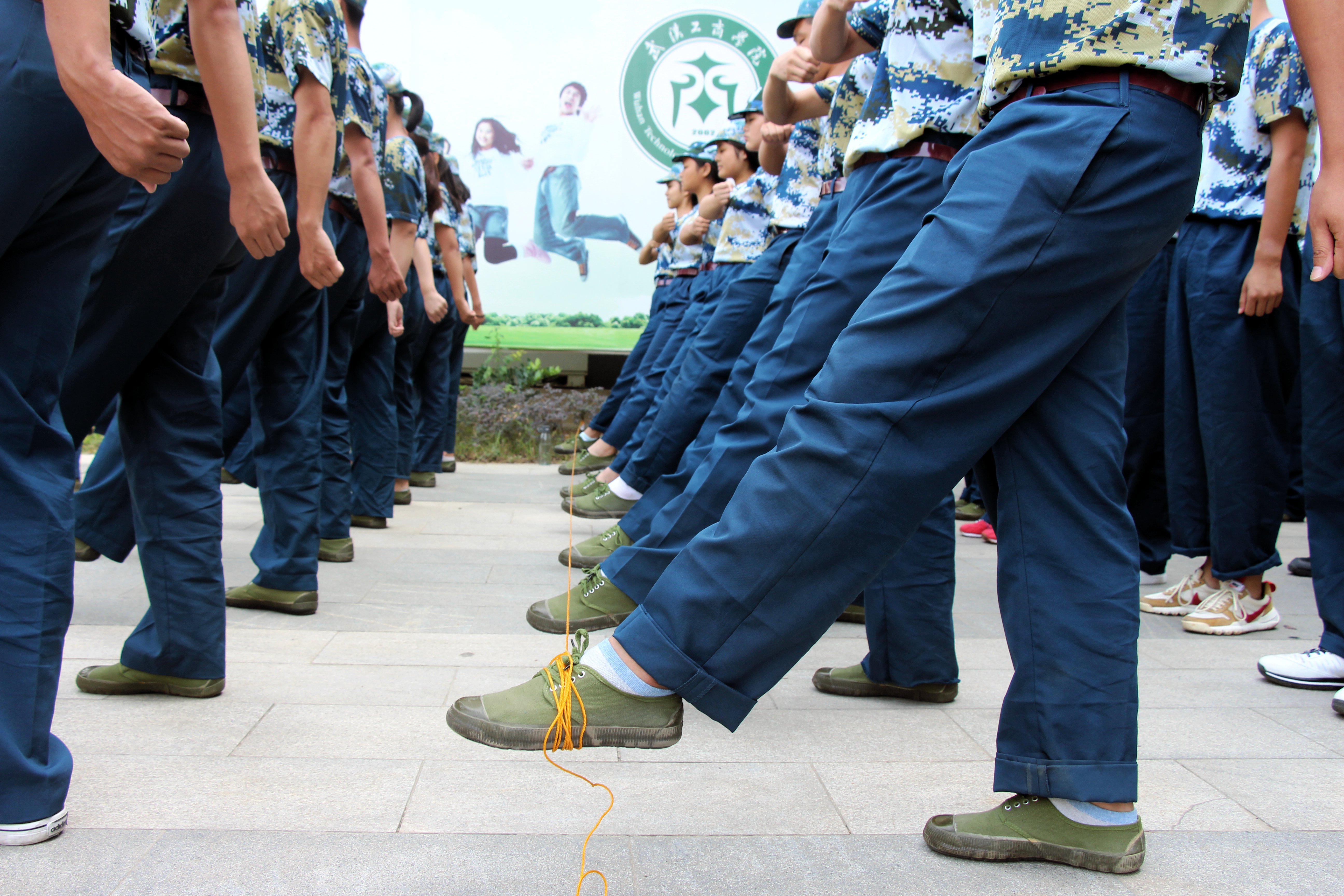 图为学生脚绑细绳训练 摄影:林倩