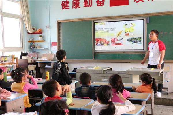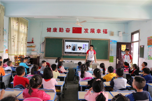 志愿者在课堂上与孩子们互动 摄影:胡敏