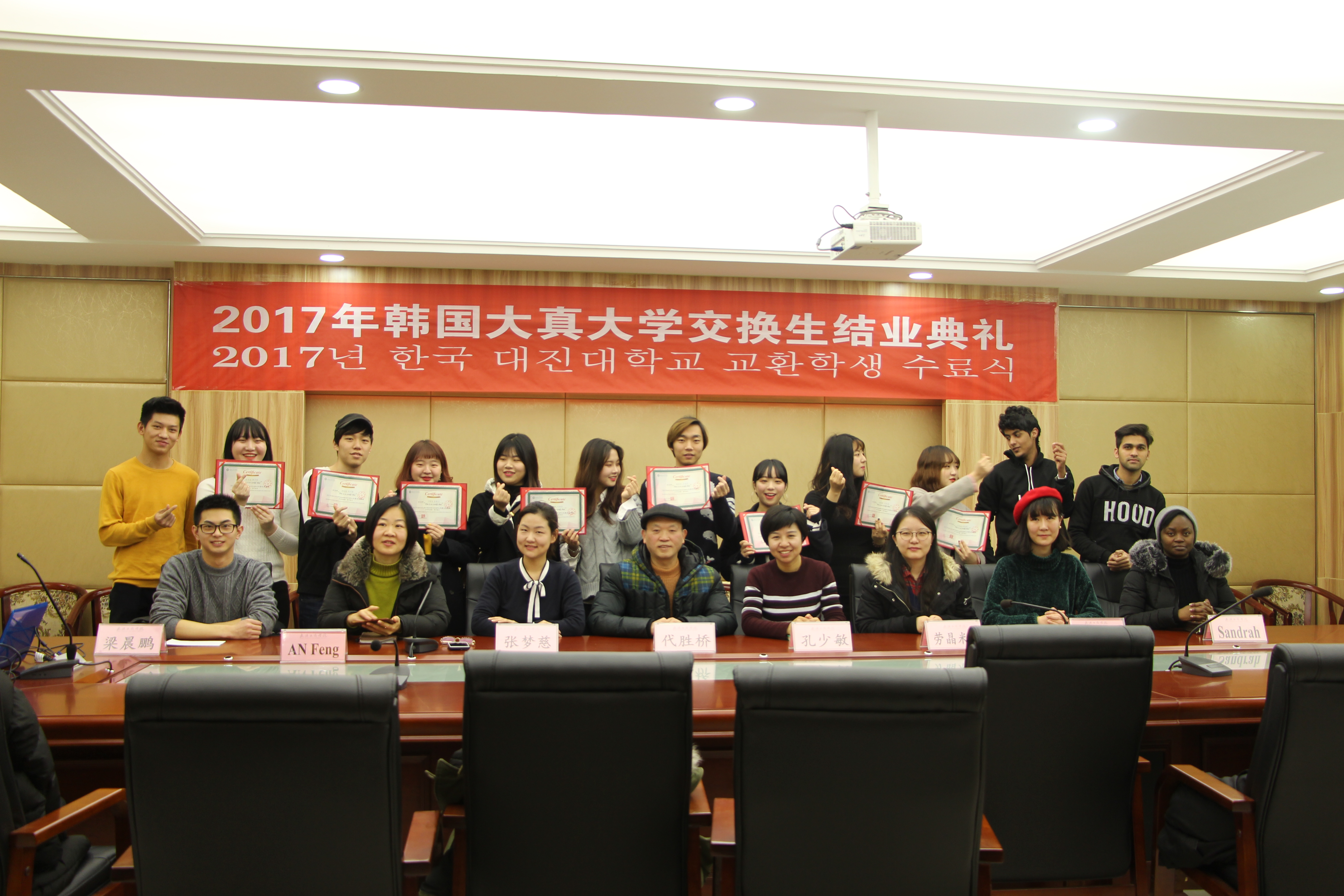 新闻中心讯(记者 杨旭 段开鑫)1月4日上午10:00,新葡的京集团35222vip于该校国际处国际会议室为韩国大真大学8位交换生举行了汉语课程结业典礼。国际教育学院院长代胜桥和该院全体老师参加了本次典礼。典礼由张梦慈老师主持。