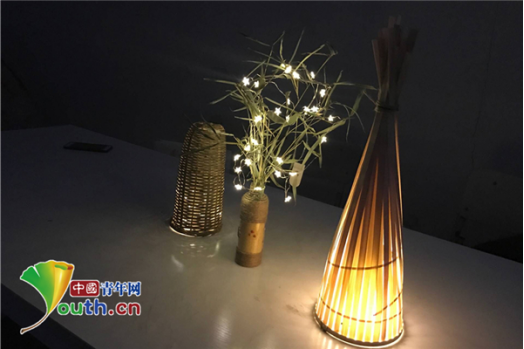 抱枕、灯具、垃圾桶、笔盒、贺卡、摆件等各式手工艺品创意十足。将竹篾编织成圆锥造型的灯罩,与废旧灯泡粘合在一起,形成了一件兼具艺术性和实用性的装饰品;以旧灯笼为雏形,将竹棍切割拼接成多边体造型,把以废旧宣纸为原材料做成的花草纸粘贴上去,就做出了一个古色古香的吊灯等。