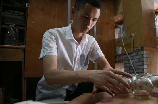 “他的手法很娴熟很专业,每次都会先帮我全身放松按摩一下,再给我拔罐,然后根据火罐留在身体上的颜色告诉我最近身体出现的一些‘小毛病’,提醒我在日常生活中应该注意什么。每次拔完罐后,我都感觉整个人很轻松,大学里能有这样一个室友真的太幸福了!”陈世聪的室友詹才钧说道。