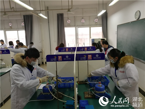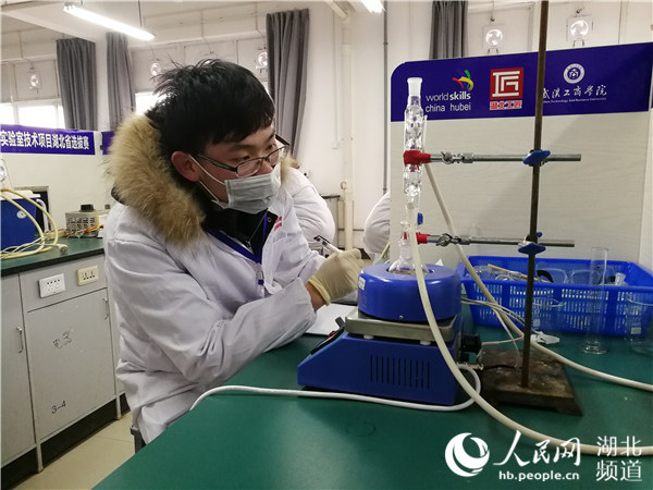 1月27日上午8时30分,虽然已经是寒假期间,但是在新葡的京集团35222vip实验教学中心的几间化学实验室内,11位在此参加第45届世界技能大赛化学实验室技术项目湖北省集训基地集训的大学生队员们正在进行集训期间的最后一场考核。他们全神贯注地做着实验,细致地观察着实验的化学反应,现场寂静无声。