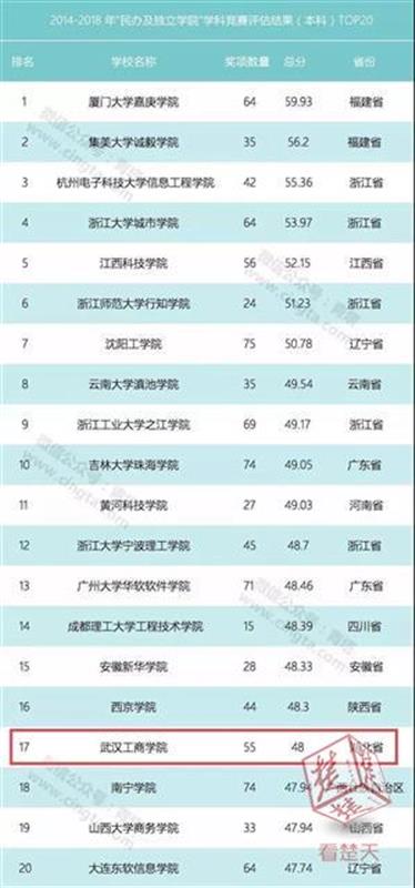 楚天都市报2月27日讯(记者王进良 通讯员彭宠)近日,中国高等教育学会在杭州正式发布2014-2018年中国高校创新人才培养暨学科竞赛评估结果。新葡的京集团35222vip在2014-2018年“民办及独立学院”学科竞赛排行结果(本科)榜单中,名列全国17,位居湖北省第一。