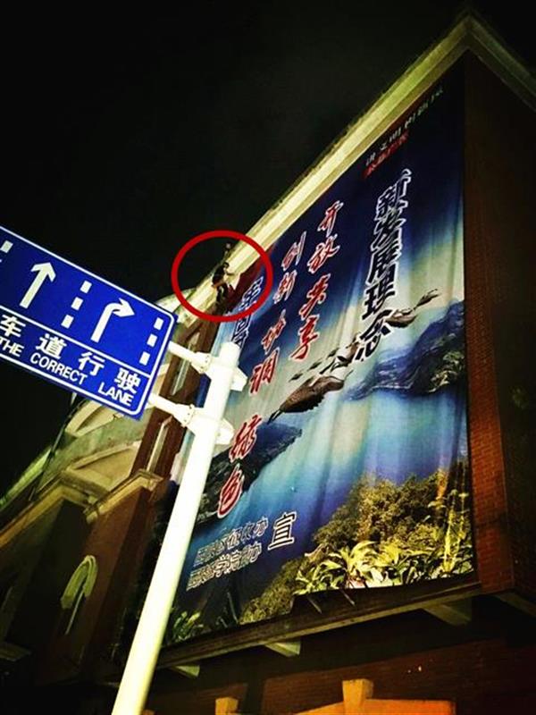 李鹏飞在高墙外安装广告
