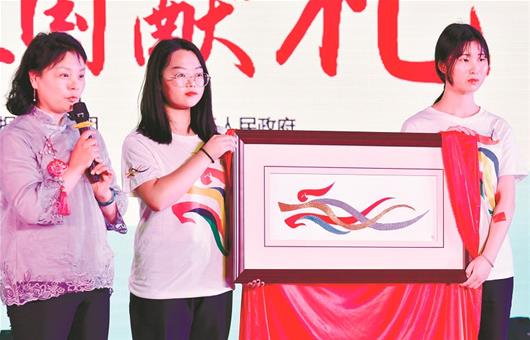 图为:汉绣会徽展示在观众面前