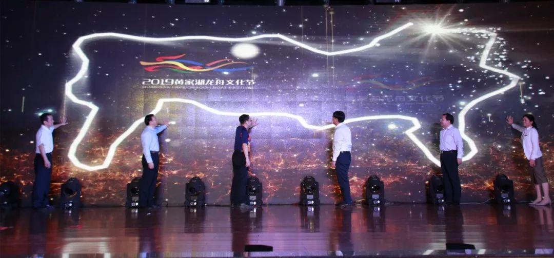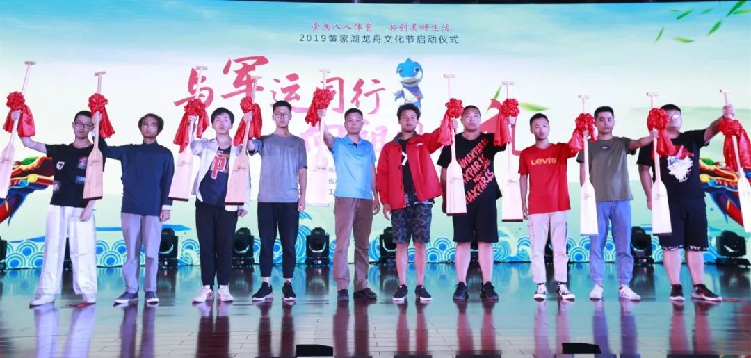 彭秀春等各局领导莅临仪式现场,集体登台正式启动2019年黄家湖龙舟文化节,并为各参赛团队的运动健儿们授予船桨。