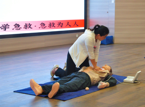最后,何老师以播放视频的方式生动地讲述了CPR的重点在于合理地按压心脏以及畅通呼吸道,为了让同学们能够正确掌握,她还在现场展开了实地演习,手把手地教学生急救技术,以加深同学们的印象。
