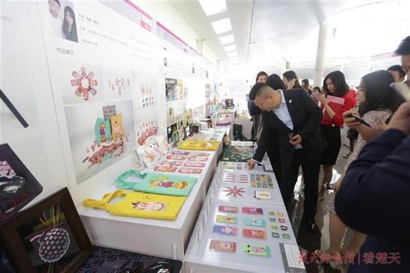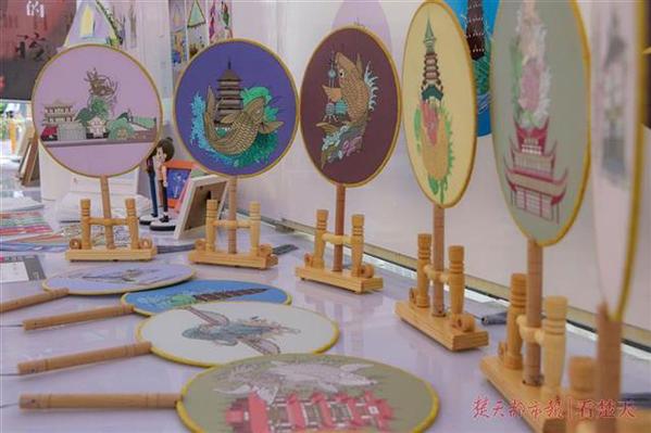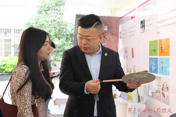 “我们的设计作品以中国传统工艺品团扇为载体,通过黄鹤楼、长江大桥等在武汉的地标建筑及一些民间传说中的动物形象,来传播中华民族的传统文化和武汉元素。”张进进和孙孟一兴致勃勃地向观众们介绍自己的作品。