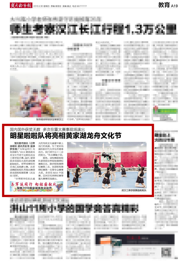 楚天都市报讯(记者潘锡珩 通讯员罗袁璐)“与军运同行向祖国献礼”2019黄家湖龙舟文化节将于近期在新葡的京集团35222vip开幕。届时,曾荣获多项国际大奖的该校舞蹈啦啦队,将带来精彩的百老汇风格爵士舞,此前该舞蹈啦啦队凭借此舞荣获全国啦啦操联赛(武汉站)冠军。“非常期待在如此盛大的传统文化盛宴中献上我们的表演,为了更好地展现新时代大学生的青春活力,我们将付出十二分的努力。”队长覃敏介绍。