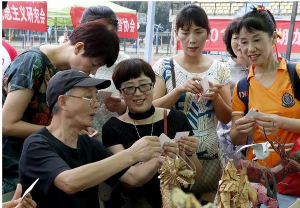 武汉折纸大师李兴旺正在教大家学习折纸 摄影:谢晓霜