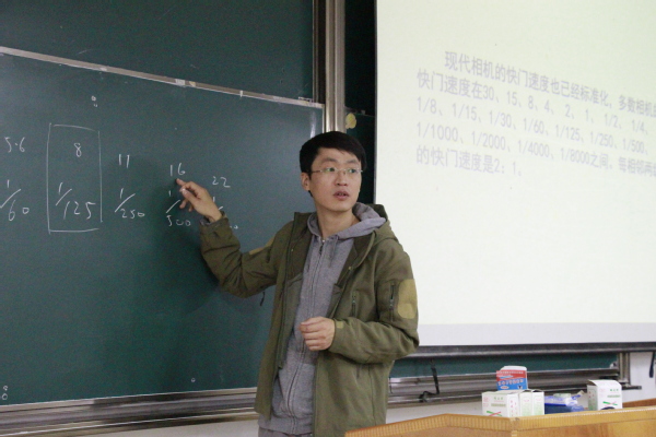 随后,牛学老师围绕曝光问题、摄影视点、照片的视觉度三方面向大家作了一一阐述。在讲解曝光问题时,他详细介绍了光圈、快门、ISO的作用,以及在各类拍摄条件下所涉及到的参数值的搭配设置和调节方法,并强调了三者之间的关系。同时,他也科普了“阳光十六法则”、不同曝光模式、景深等内容,并借用一些典型的照片作为案例,对在场所有同学进行了系列提问,让大家清晰直观地认识到拍摄照片有时要依据实际情况对相应参数进行一定的取舍。