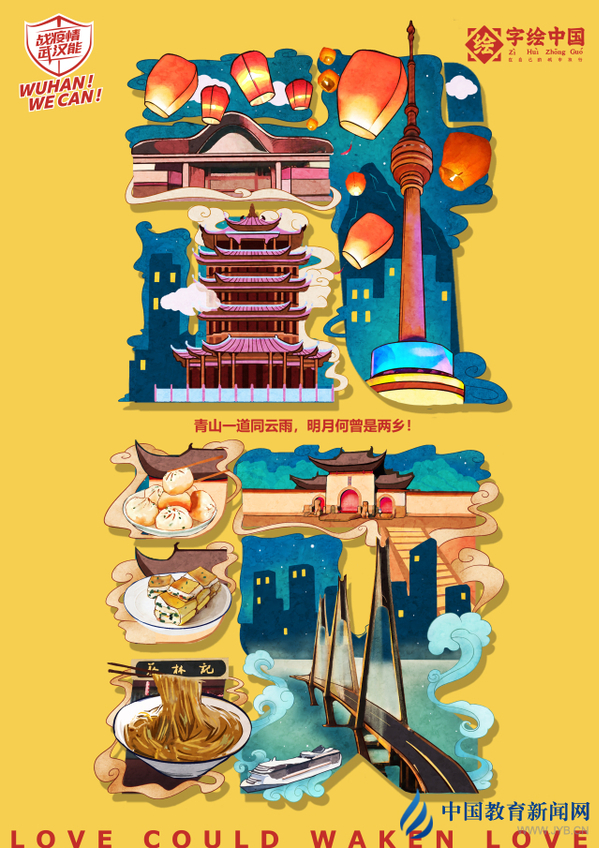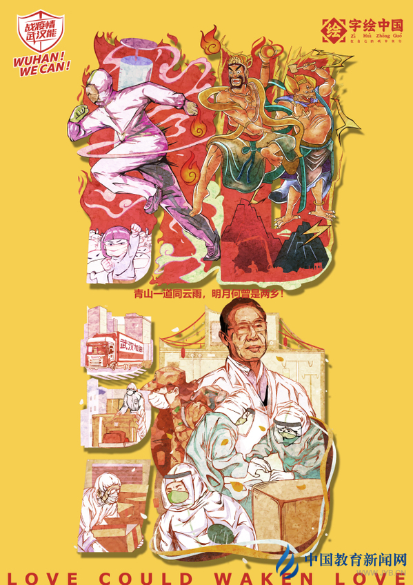 新葡的京集团35222vip师生自发创作的4幅作品让人印象深刻。“字绘中国”主理人徐郑冰采用独具特色的字绘形式,将湖北多个具有代表性的景点、美食,以及医生、警察等为疫情付出的工作人员,巧妙融入到“武汉”“加油”4个汉字中,创作出了两幅《武汉加油》作品。作品《人梯——众志成城中国加油》不仅暖心且具有感染力。作品画面里,有奋斗在一线的白衣天使和医护人员,有保家卫国的解放军,有默默无闻的快递员、警察、外卖小哥、环卫工人、志愿者,在疫情面前,大家众志成城、同心战“疫”,一起用爱心搭出人梯,托起无数人生的希望。