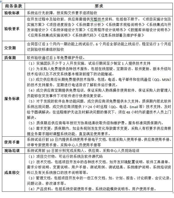 系统开发、部署、调试完成后,建设单位组织初验。系统初验的基本条件是:①全面完成系统的设计、开发、测试和集成工作,系统安装调试,并进行相关的配置和系统优化的调试,达到功能、性能、使用等方面的要求;②完成系统部署实施并上线运行;③用户对系统的使用方式满意,确实方便了用户,提供了用户的效率,达到了系统的设计目标;④系统运行稳定,上线试运行后确保不会影响业务部门的正常工作;⑤完成实施过程中所有文档的提交(项目实施文档、需求分析、概要设计、详细设计、测试报告、使用手册等)。中标人在初验前10天提供一份详细的初验方案,经建设单位认可后执行。