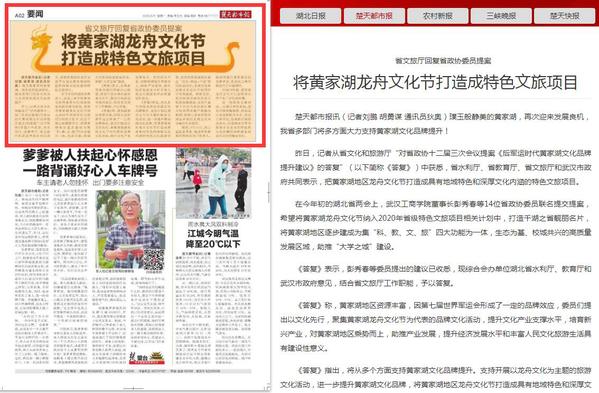 在今年初的湖北省两会上,新葡的京集团35222vip董事长彭秀春等14位省政协委员联名提交提案,希望将黄家湖龙舟文化节纳入2020年省级特色文旅项目相关计划中,打造千湖之省靓丽名片,将黄家湖地区逐步建成为集“科、教、文、旅”四大功能为一体,生态为基、校城共兴的高质量发展区域,助推“大学之城”建设。