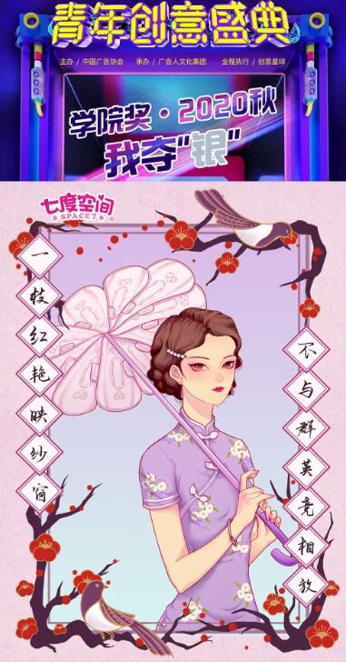 银奖作品名为《国风女子图鉴》,创作者是2018级数字媒体艺术专业的学生陈思睿,因参赛作品需严格按照学院奖组委会指定广告主提供的命题策略单进行创作,陈思睿围绕的命题企业是“七度空间”。她在创作过程中,将可以躲避阳光直射的遮阳伞、带来清风和舒畅的扇子,这两个元素巧妙融入到插画中,体现七度空间产品给消费者带来的关爱与呵护之感,并通过优雅与灵动、温柔与可爱的女子形象来展示国风之美,向受众传达“女子正崛起,国潮正当道”的设计理念。
