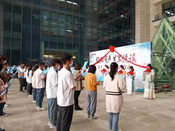 3月30日,在武汉学院陈一丹伉俪图书馆前,在几位身穿汉服的学生领诵下,大学生代表齐诵国学经典《大学》,并纷纷在“每天读书一小时”倡议横幅上签名。该校第12届读书月活动由此开启,将以“经典有声 共享悦读”为主题,相继举办“百部经典”阅读打卡、传统文化知识竞赛、“因书而美”主题书展、书库寻宝、“图书馆之星”评选等活动。