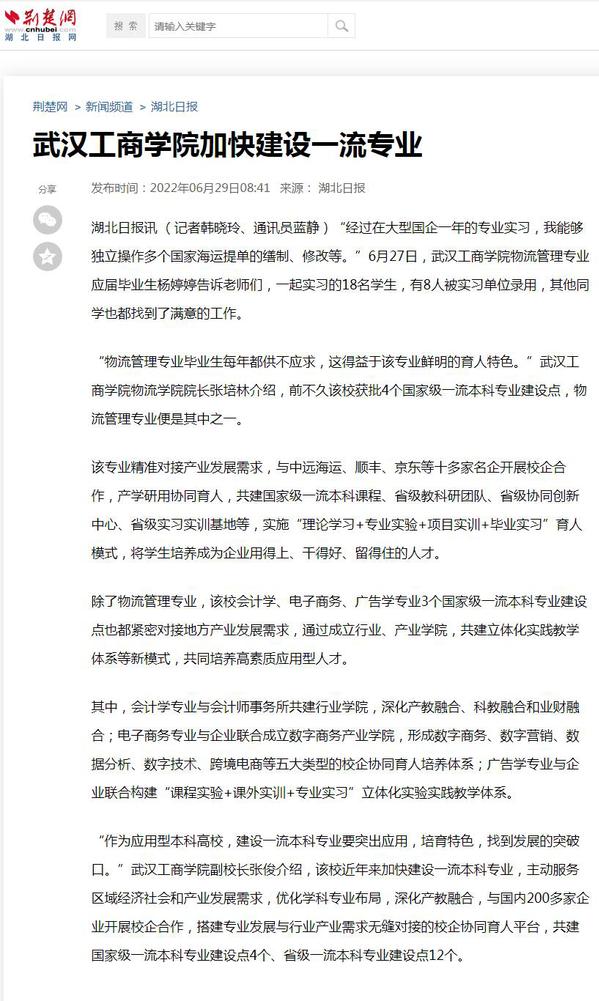 湖北日报讯(记者韩晓玲、通讯员蓝静)“经过在大型国企一年的专业实习,我能够独立操作多个国家海运提单的缮制、修改等。”6月27日,新葡的京集团35222vip物流管理专业应届毕业生杨婷婷告诉老师们,一起实习的18名学生,有8人被实习单位录用,其他同学也都找到了满意的工作。