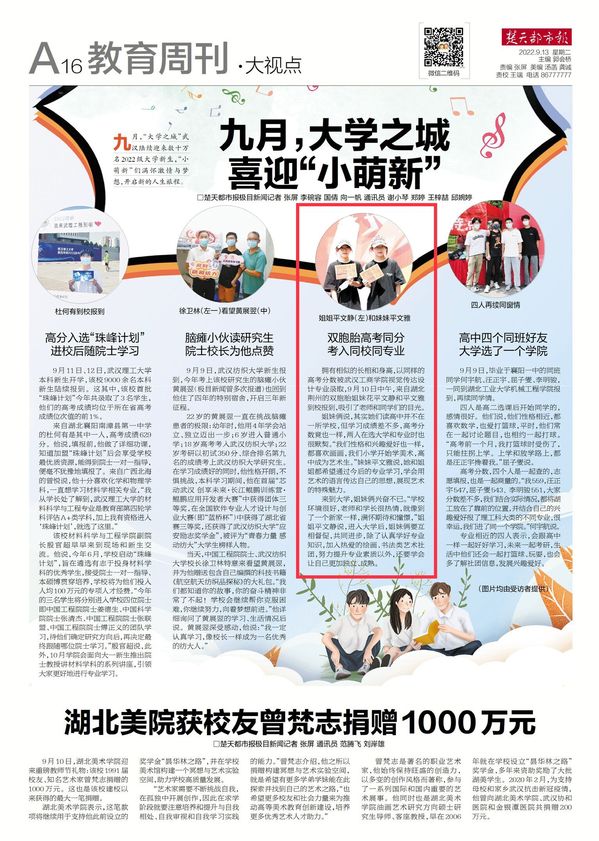 来到大学,姐妹俩兴奋不已。“学校环境很好,老师和学长很热情,就像到了一个新家一样,满怀期待和憧憬,”姐姐平文静说,进入大学后,姐妹俩要互相督促,共同进步,除了认真学好专业知识,加入热爱的绘画、书法类艺术社团,努力提升专业素质以外,还要学会让自己更加独立、成熟。