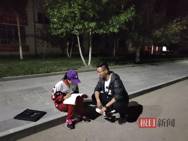 2019年余寿勇在西藏自治区日喀则市仁布县中学外路灯下与自主学习的学生交流并指导其物理知识