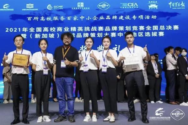 桂羽勤(右三)和同学们在全球品牌策划大赛中国地区选拔赛中获一等奖