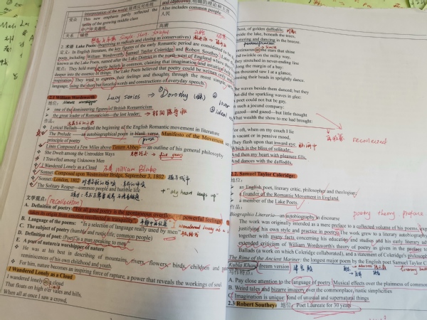 由于英国文学相较于美国文学,经历了更长期、更复杂的发展演变过程,要学深学透非常不易,谈洋便以表格的形式整理、分析、总结英国文学史上不同作家们的作品、流派、特点,这样复习起来更加清晰明了。此外,他还根据不同阶段、不同学科的特点调整自己的复习战略,比如针对政治这门学科,他选择刷题和背书相结合的方式来进行不断巩固和提高。