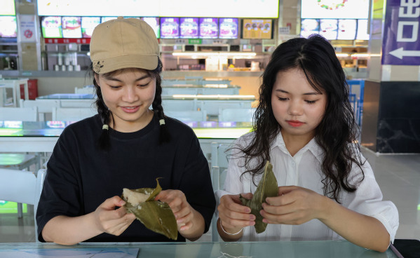 据该校后勤管理部工作人员介绍,去年和今年的端午节,学校都向全校学生免费发放了粽子,今年发放的粽子有豆沙、蜜枣和八宝3种口味,全校学生可凭统一发放的餐券前往学校一食堂和二食堂一楼免费领取1个粽子。在1栋学生宿舍332寝室,同学们拿着粽子高兴地拍照留念,并一起品尝。寝室内文法学院大二学生詹兰芳一边吃粽子一边介绍道:“我来学校不到两年,就已经吃了两次免费的校庆餐和两次免费的粽子了,粽子甜甜的,心里暖暖的!”