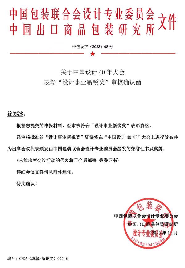 此外,12月16日,中国设计40年表彰大会·第十六届中国之星设计奖颁奖典礼暨绿色发展与创新设计论坛在北京举办,徐郑冰凭借丰富的项目设计和品牌包装经验荣获“中国设计40年·设计事业新锐奖”。