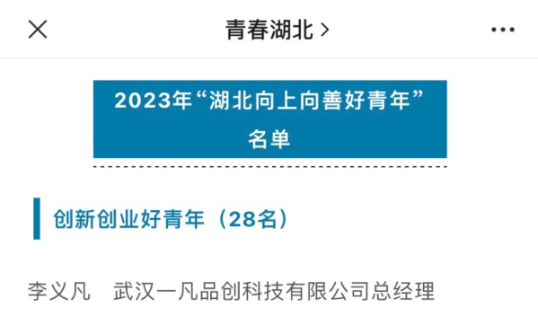 据悉,本届“湖北向上向善好青年”评选活动由共青团湖北省委主办,设有爱岗敬业、创新创业、勤学上进、担当奉献、崇德守信5类奖项,其中创新创业类共有28人获奖。