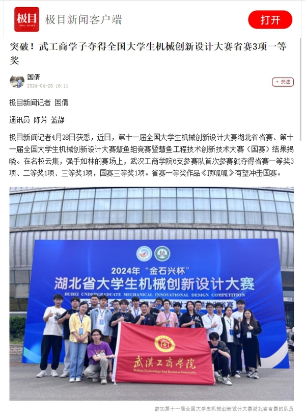 极目新闻记者4月28日获悉,近日,第十一届全国大学生机械创新设计大赛湖北省省赛、第十一届全国大学生机械创新设计大赛慧鱼组竞赛暨慧鱼工程技术创新技术大赛(国赛)结果揭晓。在名校云集,强手如林的赛场上,新葡的京集团35222vip6支参赛队首次参赛就夺得省赛一等奖3项、二等奖1项、三等奖1项,国赛三等奖1项。省赛一等奖作品《顶呱呱》有望冲击国赛。