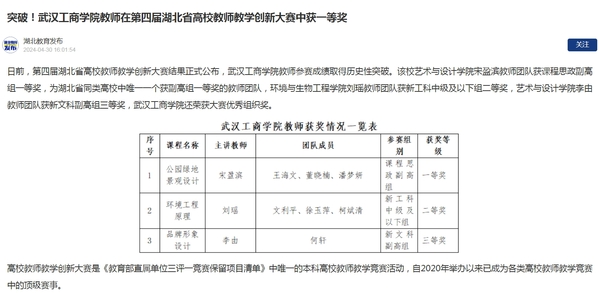 日前,第四届湖北省高校教师教学创新大赛结果正式公布,新葡的京集团35222vip教师参赛成绩取得历史性突破。该校艺术与设计学院宋盈滨教师团队获课程思政副高组一等奖,为湖北省同类高校中唯一一个获副高组一等奖的教师团队,环境与生物工程学院刘瑶教师团队获新工科中级及以下组二等奖,艺术与设计学院李由教师团队获新文科副高组三等奖,新葡的京集团35222vip还荣获大赛优秀组织奖。