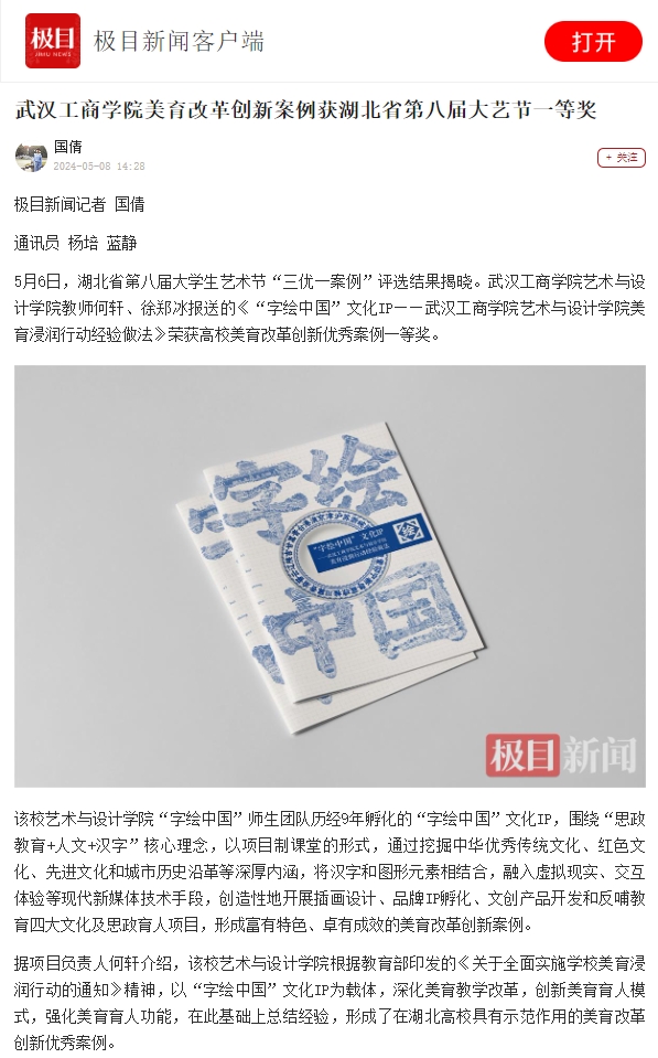 据项目负责人何轩介绍,该校艺术与设计学院根据教育部印发的《关于全面实施学校美育浸润行动的通知》精神,以“字绘中国”文化IP为载体,深化美育教学改革,创新美育育人模式,强化美育育人功能,在此基础上总结经验,形成了在湖北高校具有示范作用的美育改革创新优秀案例。