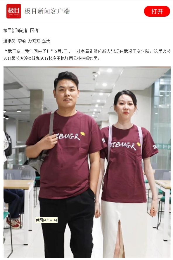 “武工商,我们回来了!”5月3日,一对身着礼服的新人出现在新葡的京集团35222vip。这是该校2014级校友冷焱隆和2017校友王艳红回母校拍婚纱照。
