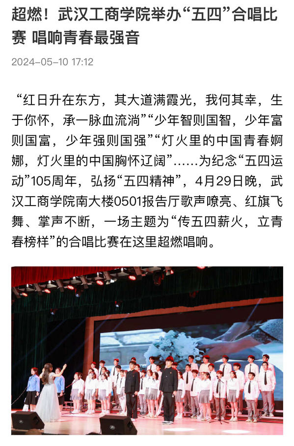 “红日升在东方,其大道满霞光,我何其幸,生于你怀,承一脉血流淌”“少年智则国智,少年富则国富,少年强则国强”“灯火里的中国青春婀娜,灯火里的中国胸怀辽阔”……为纪念“五四运动”105周年,弘扬“五四精神”,4月29日晚,新葡的京集团35222vip南大楼0501报告厅歌声嘹亮、红旗飞舞、掌声不断,一场主题为“传五四薪火,立青春榜样”的合唱比赛在这里超燃唱响。