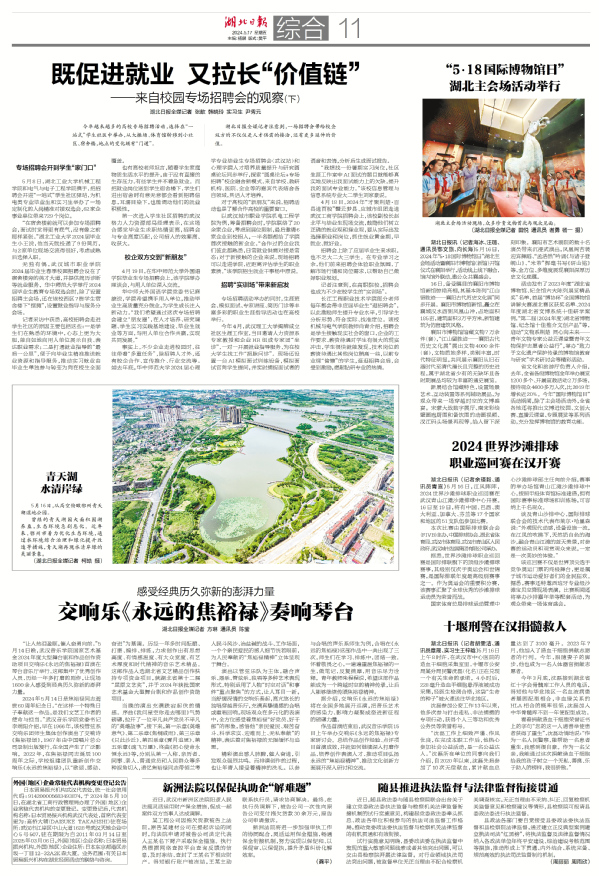 上月,武汉大学举行测绘遥感类暨地理信息专业春季专场招聘会,全国70多家优质行业单位参会,吸引了2024届本硕博毕业生和其他年级学生前来。这种行业专场招聘会的形式,有效提高了用人单位和求职学子的参与热情。学子点赞说,专业适配性更强。