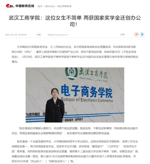 赵志雪是一个全面发展的学生,大学期间她刻苦学习专业知识,还担任班级团支书等职务,连续三年专业成绩排名第一,两次获得国家奖学金,发表学术论文4篇,获评校级“模范团干”“三好学生”“优秀学生干部”等荣誉。同时她积极参加各类创新创业竞赛,曾获第十二届全国大学生电子商务“创新、创意及创业”挑战赛全国总决赛一等奖、第八届OCALE全国跨境电商创新创业能力大赛本科组个人特等奖和团队特等奖,并获评2022年度“洪山好人”(“创新创业好人”)等。