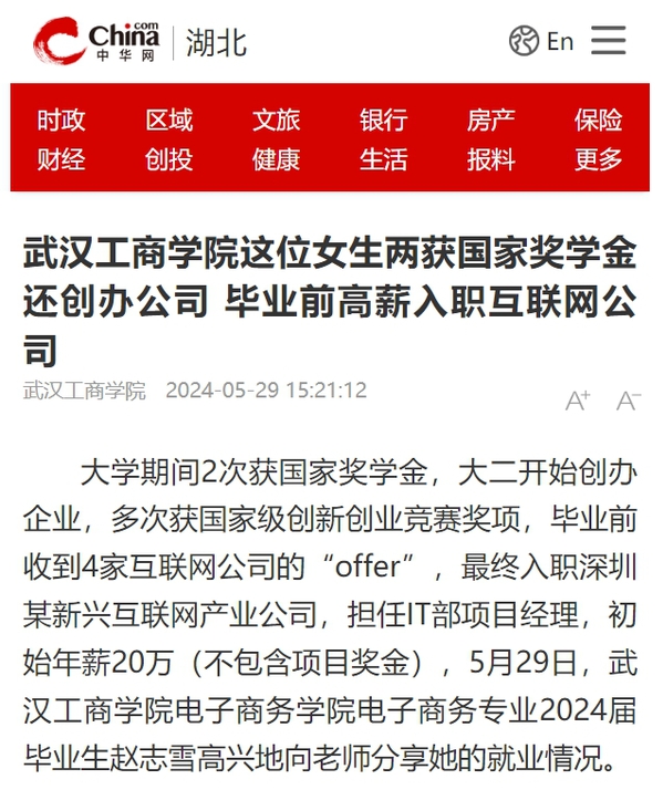 赵志雪是一个全面发展的学生,大学期间她刻苦学习专业知识,还担任班级团支书等职务,连续三年专业成绩排名第一,两次获得国家奖学金,发表学术论文4篇,获评校级“模范团干”“三好学生”“优秀学生干部”等荣誉。同时她积极参加各类创新创业竞赛,曾获第十二届全国大学生电子商务“创新、创意及创业”挑战赛全国总决赛一等奖、第八届OCALE全国跨境电商创新创业能力大赛本科组个人特等奖和团队特等奖,并获评2022年度“洪山好人”(“创新创业好人”)等。