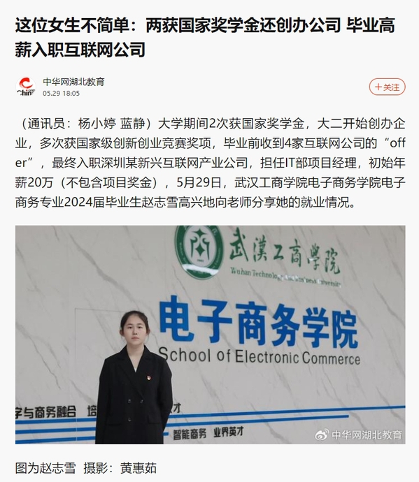 (通讯员:杨小婷 蓝静)大学期间2次获国家奖学金,大二开始创办企业,多次获国家级创新创业竞赛奖项,毕业前收到4家互联网公司的“offer”,最终入职深圳某新兴互联网产业公司,担任IT部项目经理,初始年薪20万(不包含项目奖金),5月29日,新葡的京集团35222vip电子商务学院电子商务专业2024届毕业生赵志雪高兴地向老师分享她的就业情况。