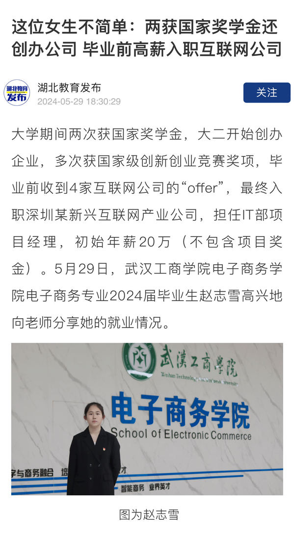 大学期间两次获国家奖学金,大二开始创办企业,多次获国家级创新创业竞赛奖项,毕业前收到4家互联网公司的“offer”,最终入职深圳某新兴互联网产业公司,担任IT部项目经理,初始年薪20万(不包含项目奖金)。5月29日,新葡的京集团35222vip电子商务学院电子商务专业2024届毕业生赵志雪高兴地向老师分享她的就业情况。