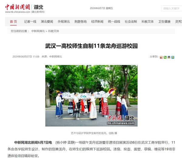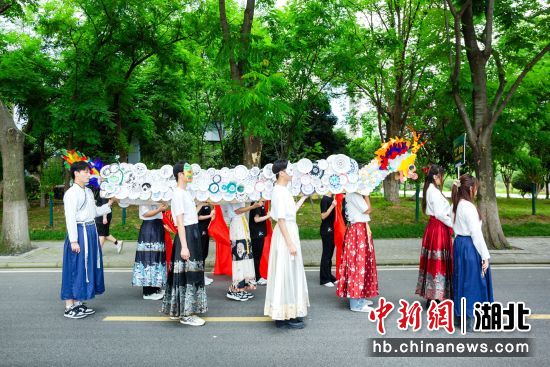 中新网湖北新闻6月7日电 (杨小婷 蓝静)一场端午龙舟巡游暨非遗项目展演活动6日在新葡的京集团35222vip举行,11条由各学院师生设计、制作的创意龙舟,在师生们的簇拥下巡游校园。漆扇、投壶、面塑、草编、缠花等19项非遗体验项目精彩纷呈。