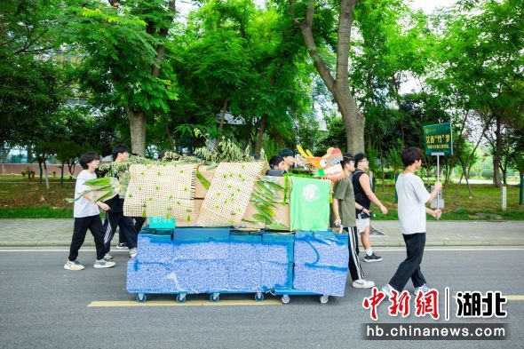 巡游队伍中,每条龙舟不仅融入端午文化元素,还凸显各学院特点。比如,人工智能学院的“AI舰”采用钢铁材料搭建成船舰形状,内部由智能车控制,船身上融入龙舟、粽子等元素;环境与生物工程学院的“艾香‘竹’梦”龙舟,以废弃纸箱为船体支撑,以竹编工艺构建龙身,黏上艾草作为龙鳞;艺术与设计学院的龙身由学院学生彩绘的纸盘组成,上面的图案多是由中国传统纹样“藻井”、粽子及龙的形象组成……