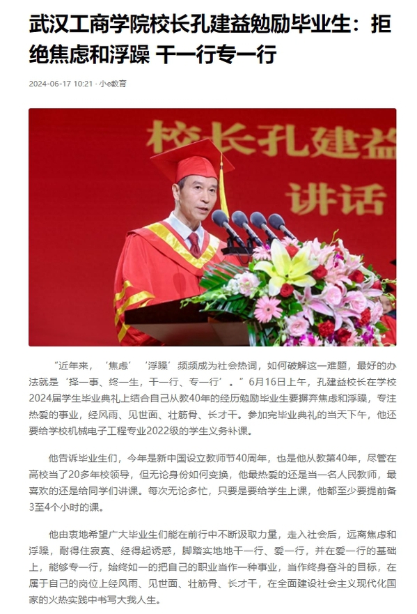 “近年来,‘焦虑’‘浮躁’频频成为社会热词,如何破解这一难题,最好的办法就是‘择一事、终一生,干一行、专一行’。”6月16日上午,孔建益校长在学校2024届学生毕业典礼上结合自己从教40年的经历勉励毕业生要摒弃焦虑和浮躁,专注热爱的事业,经风雨、见世面、壮筋骨、长才干。参加完毕业典礼的当天下午,他还要给学校机械电子工程专业2022级的学生义务补课。